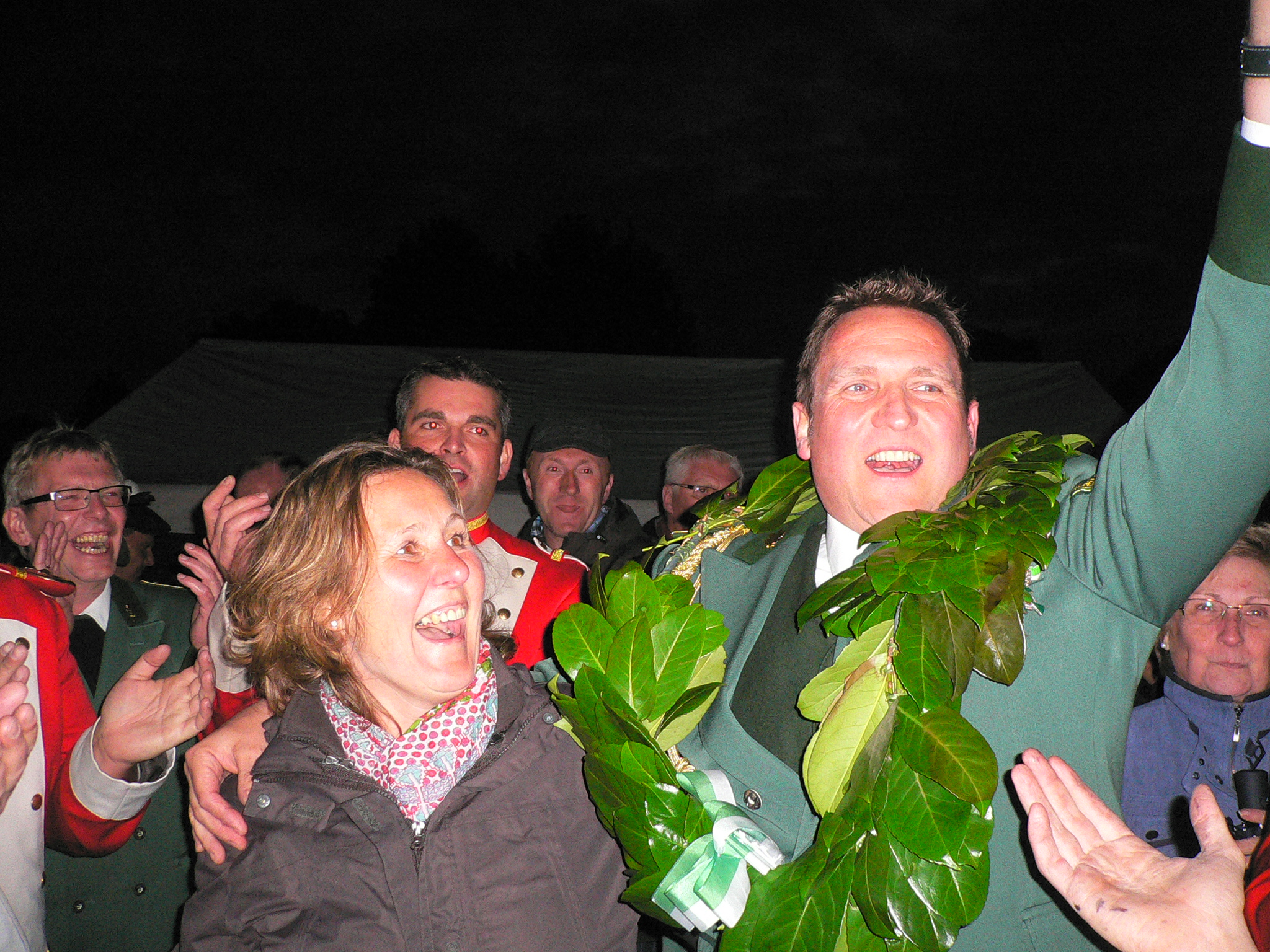 Ungewöhnlich lange hatten sechs Aspiranten versucht, den Vogel zu erlegen, ehe dieser endlich um 21:50 Uhr, nur 10 Minuten später als beim letzten Schützenfest 2012, von der Stange fiel. Unter großem Jubel der ausharrenden, zahlreichen Zuschauer durfte der strahlende König das Bad in der Menge mit seiner Frau und Königin Carmen genießen und sich auf der anschließenden Zeltparty feiern lassen.