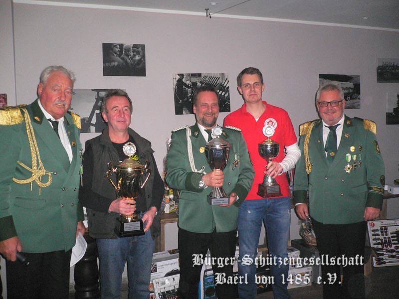 Den Pokal der Sparkasse am Niederrhein errang Björn Reimer, Hauptmann der Sappeure, mit 36 Ringen. Der Pokal der Freiwilligen Feuerwehr, Löschzug Baerl ging mit 38 Ringen an Helmut Bregulla.