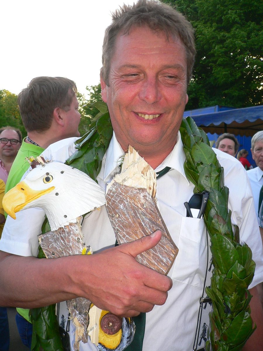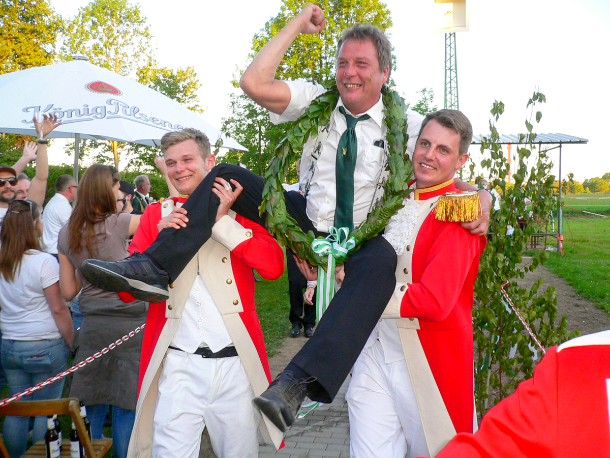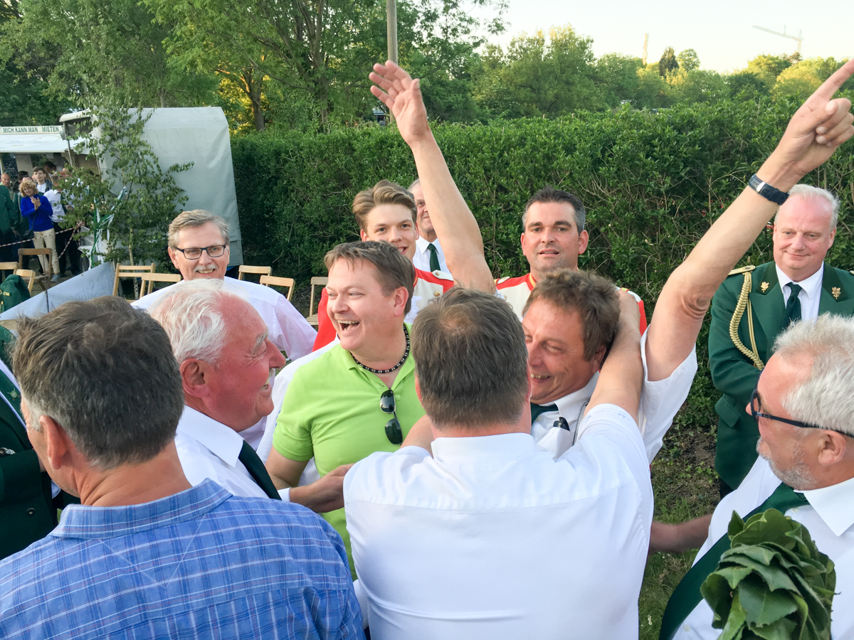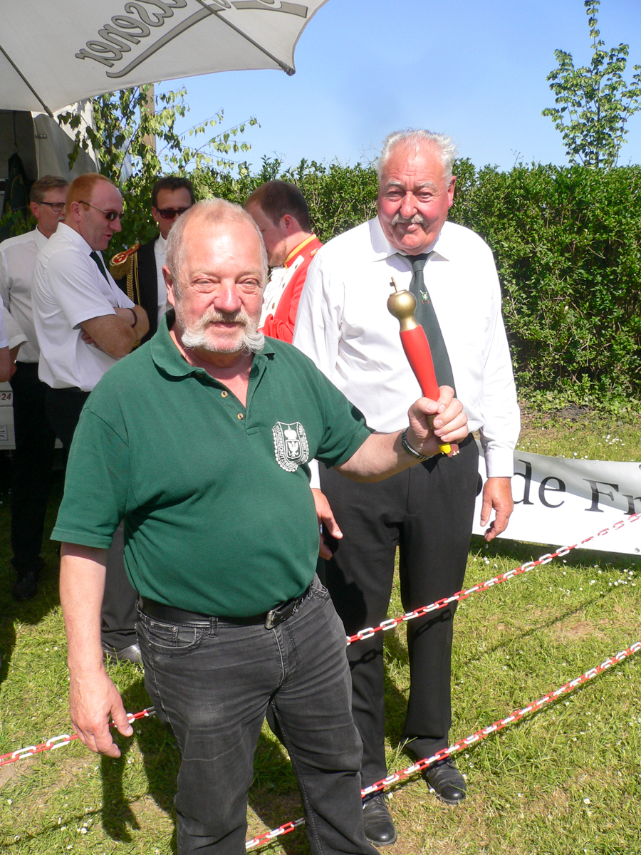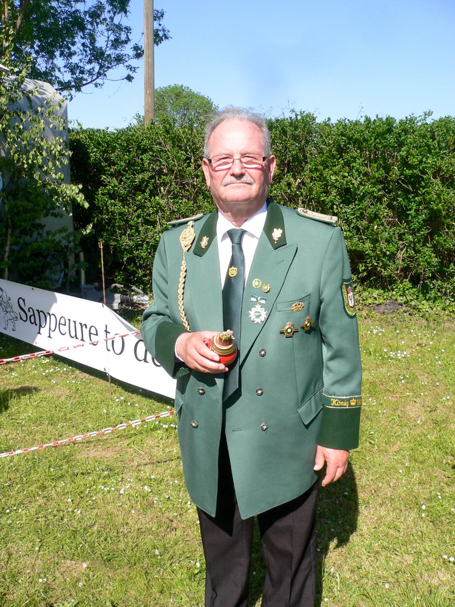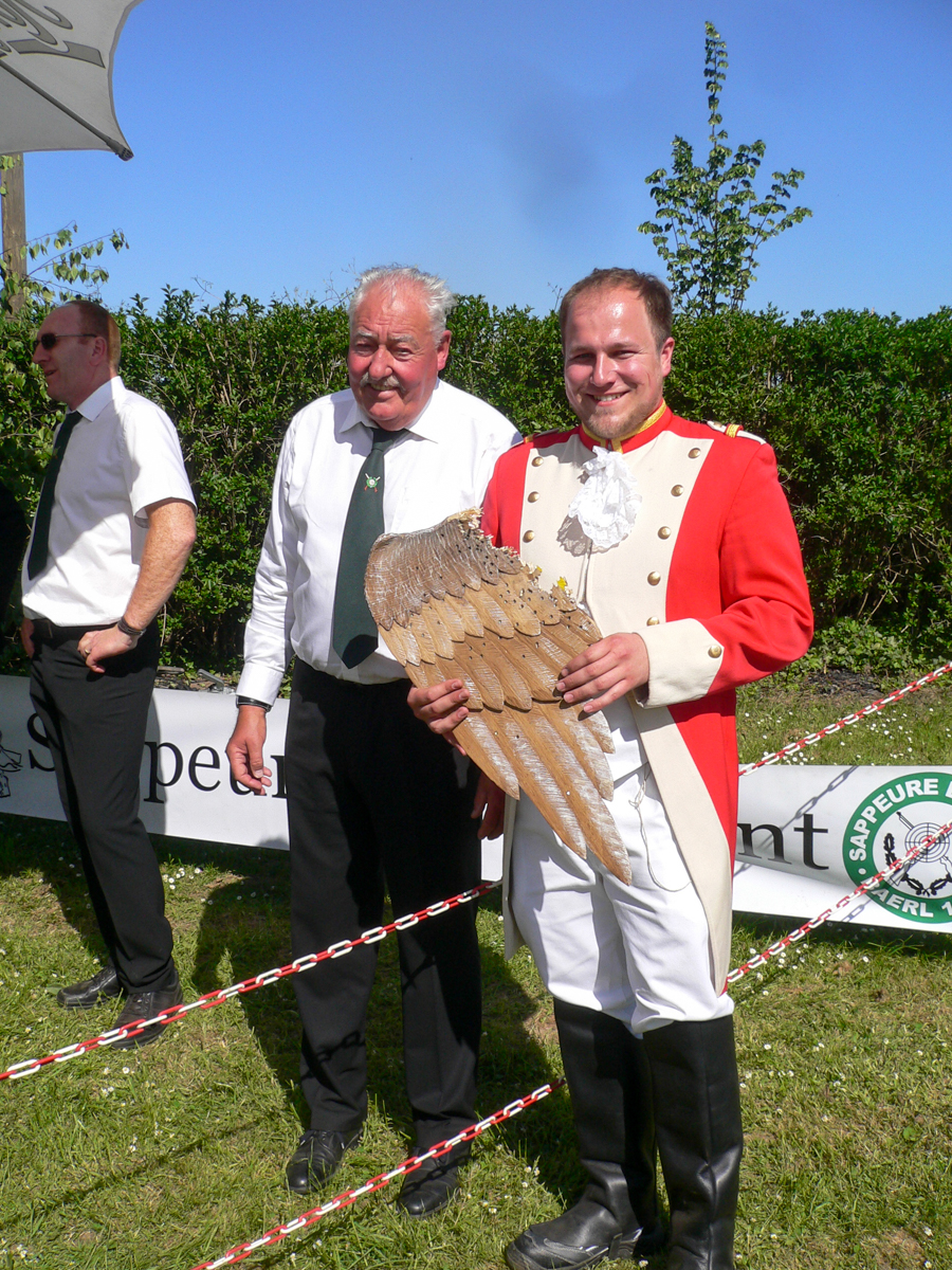 Bei genialem Sommerwetter und angefeuert von einer großen Zuschauermenge hatten sich Dirk Hollender, Andreas Kempken, Heinz Frütel, Nils Meyer, Stefan Heigbes und Kurt Dawirs dem äußerst spannenden und fairen Wettkampf gestellt. Nachdem Nils Meyer, aktiver Sappeur, schon einen großen Teil vom Fuß des Vogels abgeschossen hatte, gelang Heinz Frütel mit dem 217. Schuss um 20.15 Uhr der Treffer zum ersehnten Sieg und damit zur Königswürde.