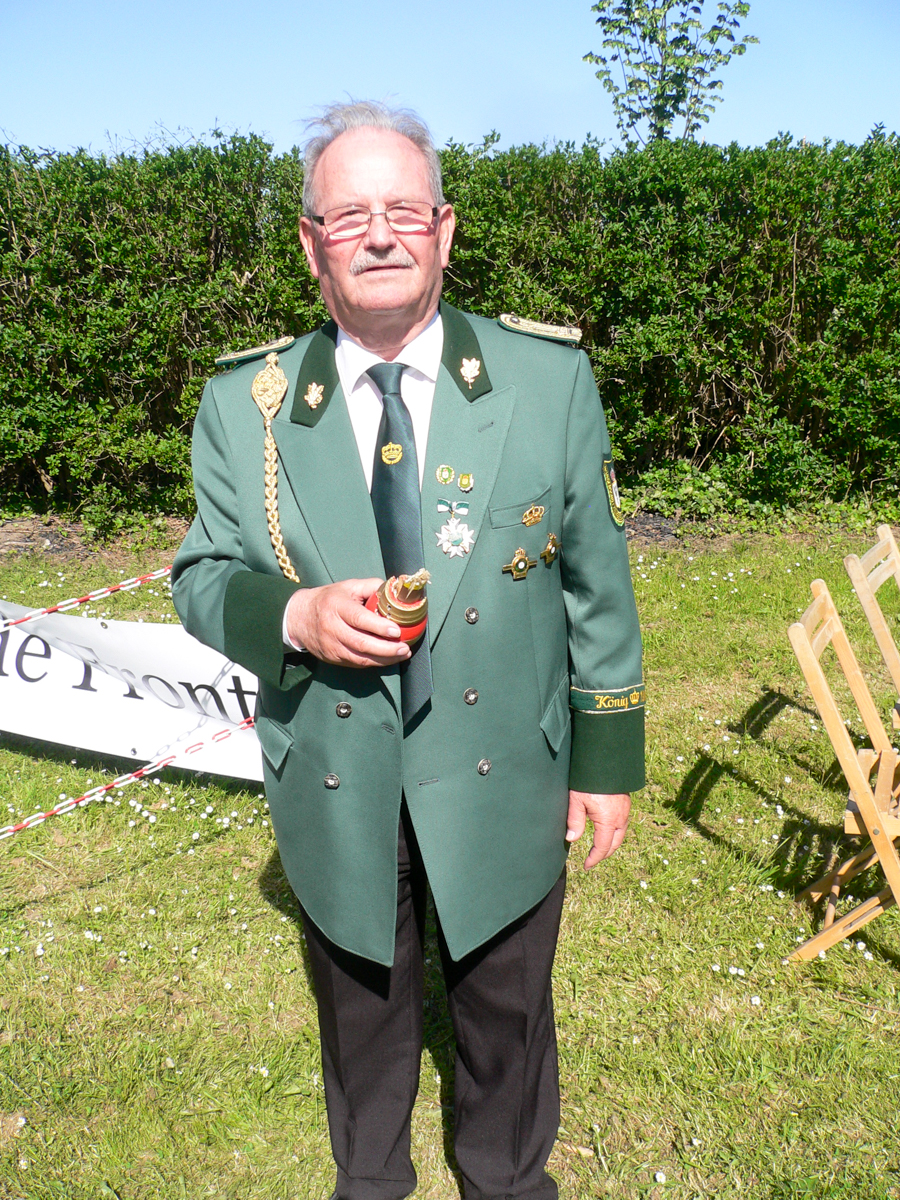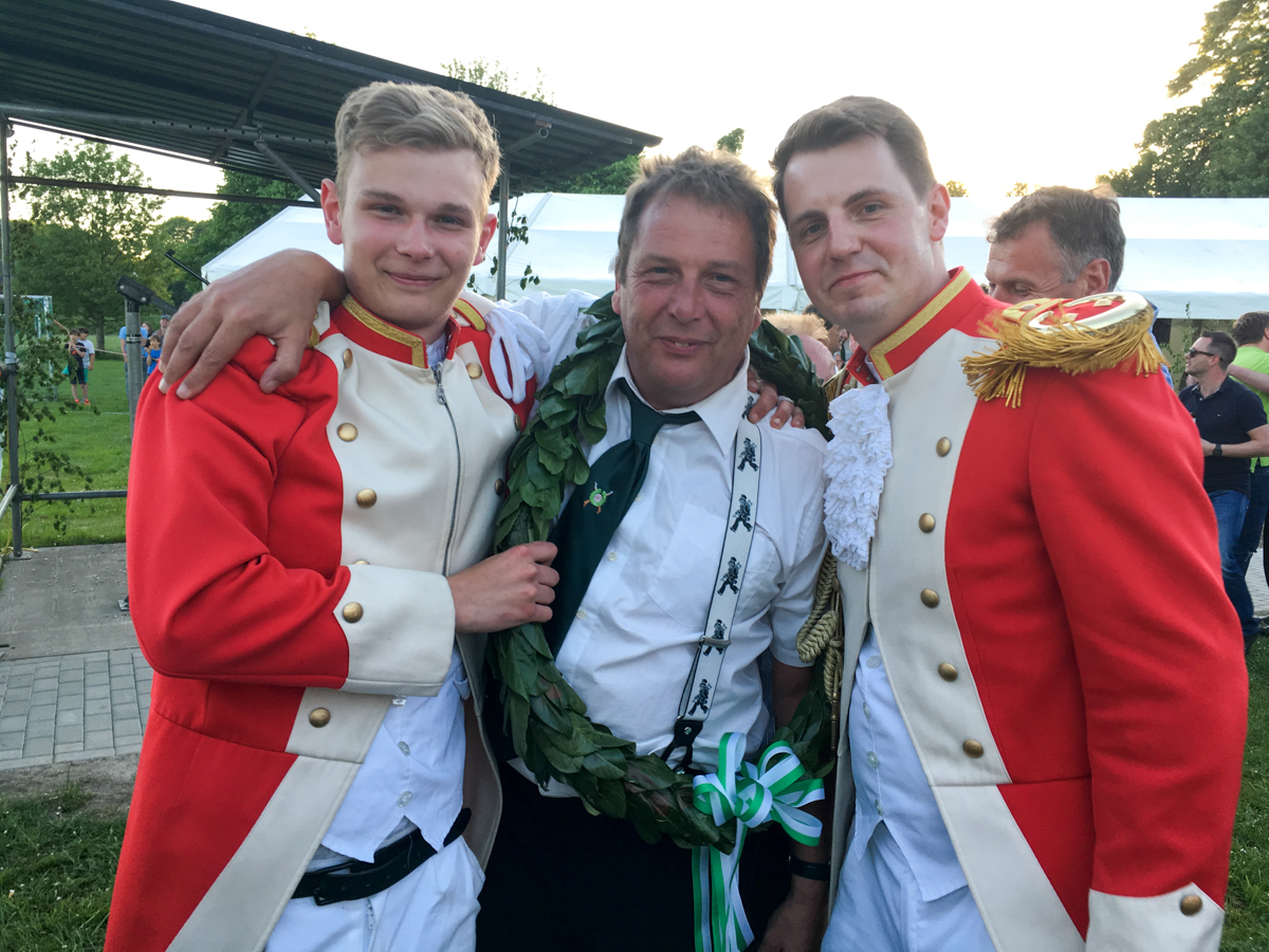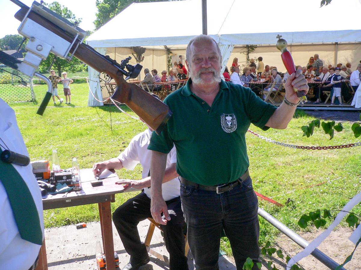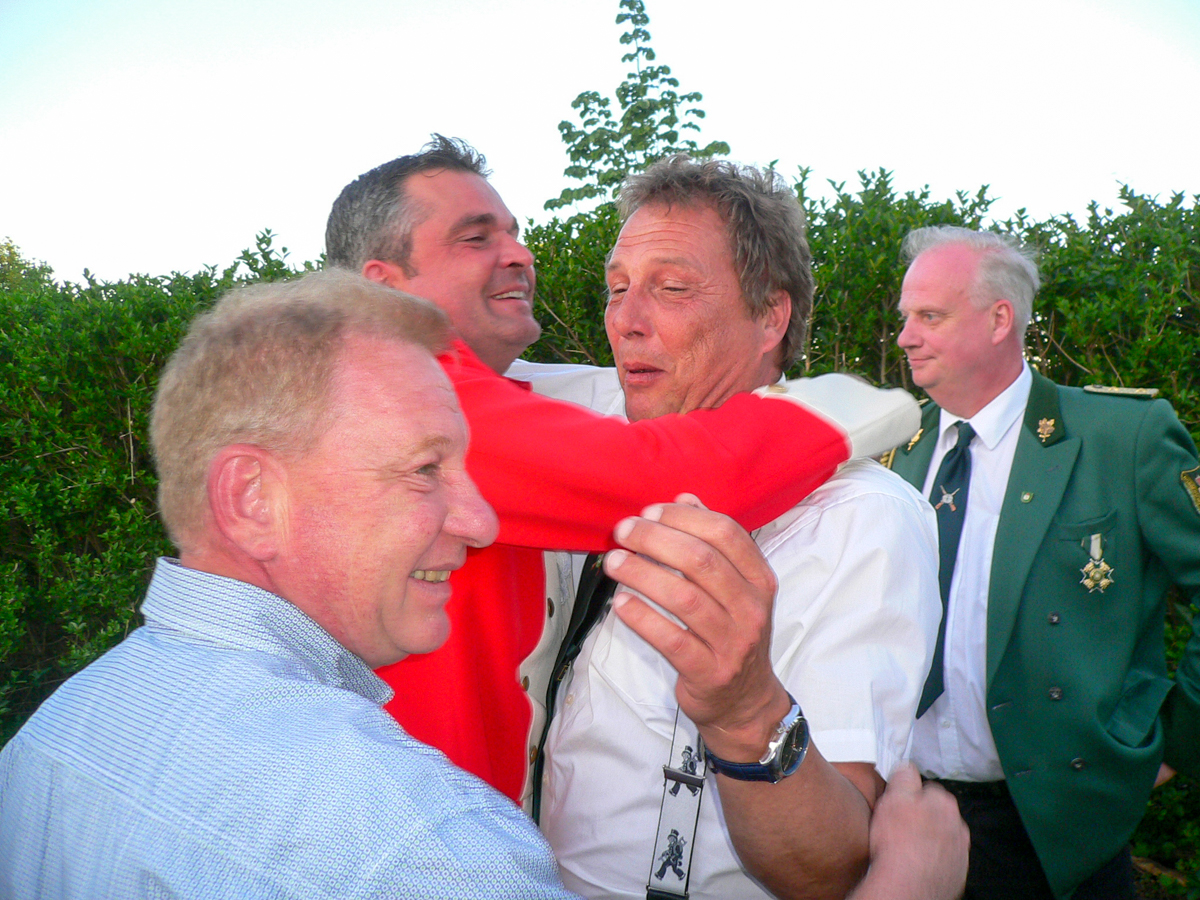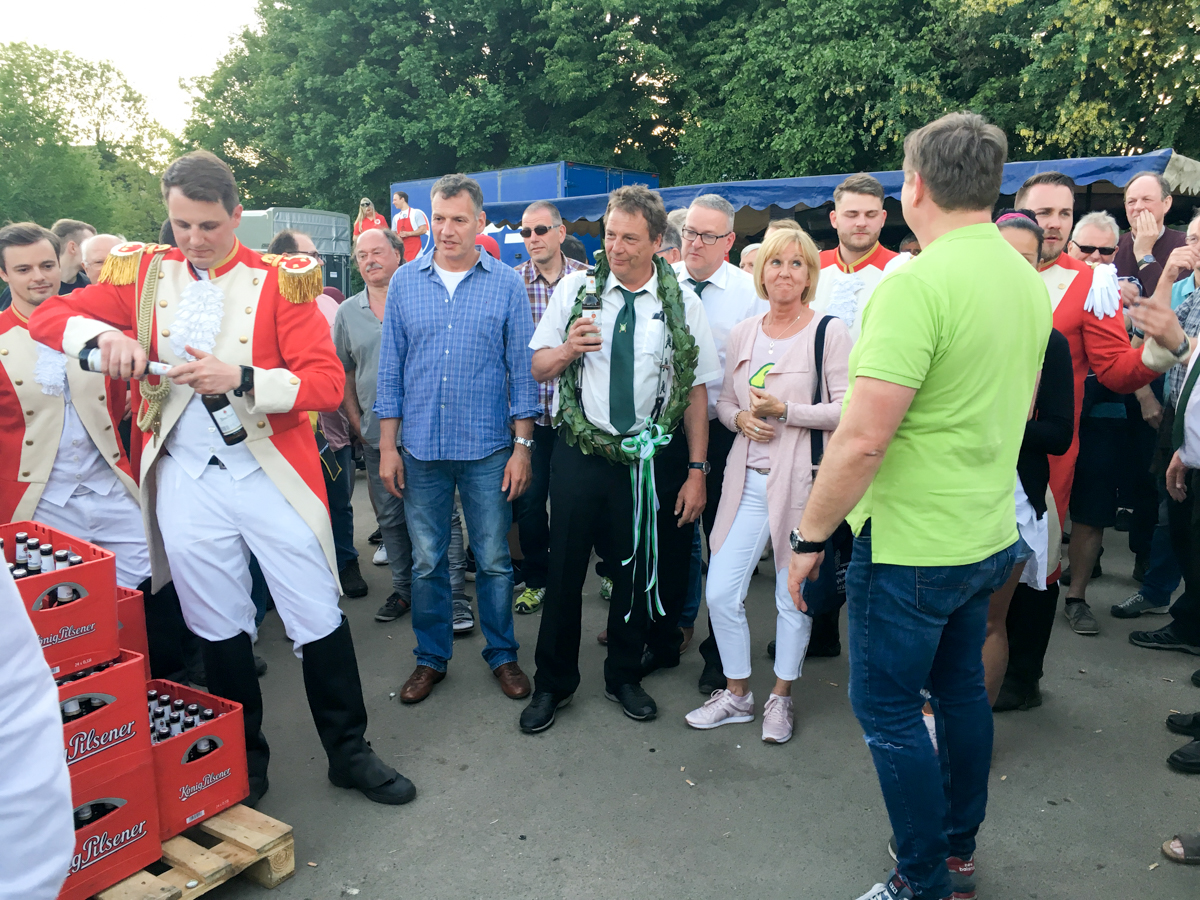 Bei genialem Sommerwetter und angefeuert von einer großen Zuschauermenge hatten sich Dirk Hollender, Andreas Kempken, Heinz Frütel, Nils Meyer, Stefan Heigbes und Kurt Dawirs dem äußerst spannenden und fairen Wettkampf gestellt. Nachdem Nils Meyer, aktiver Sappeur, schon einen großen Teil vom Fuß des Vogels abgeschossen hatte, gelang Heinz Frütel mit dem 217. Schuss um 20.15 Uhr der Treffer zum ersehnten Sieg und damit zur Königswürde.