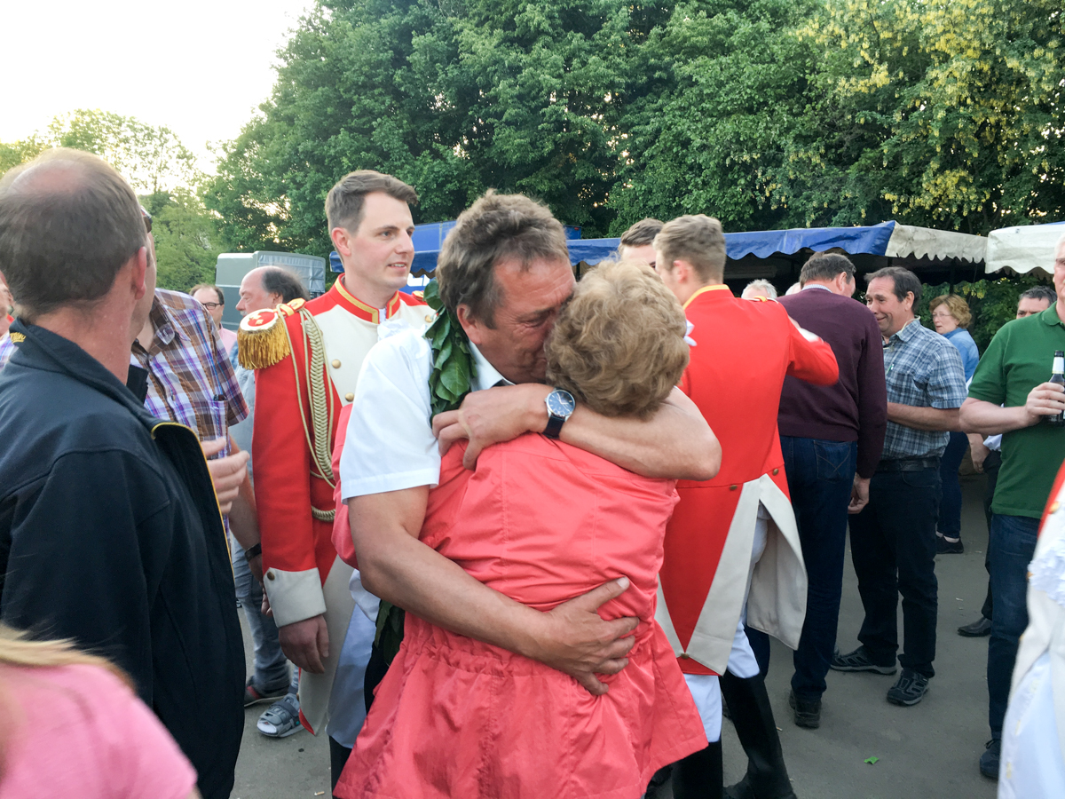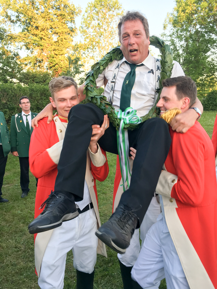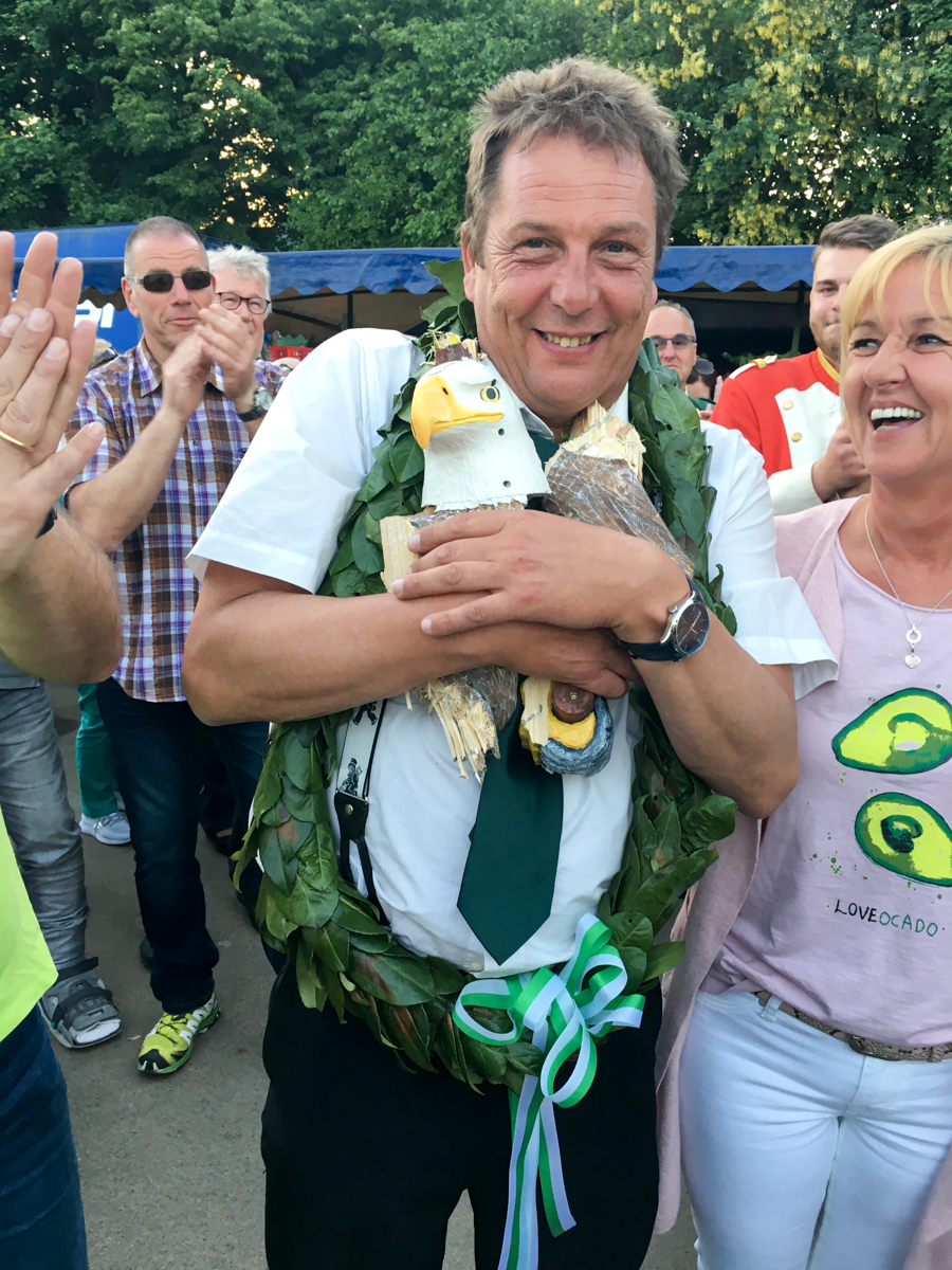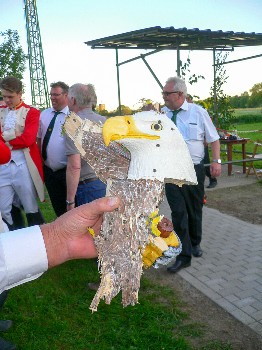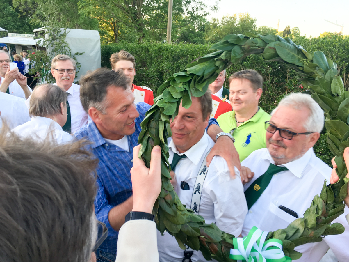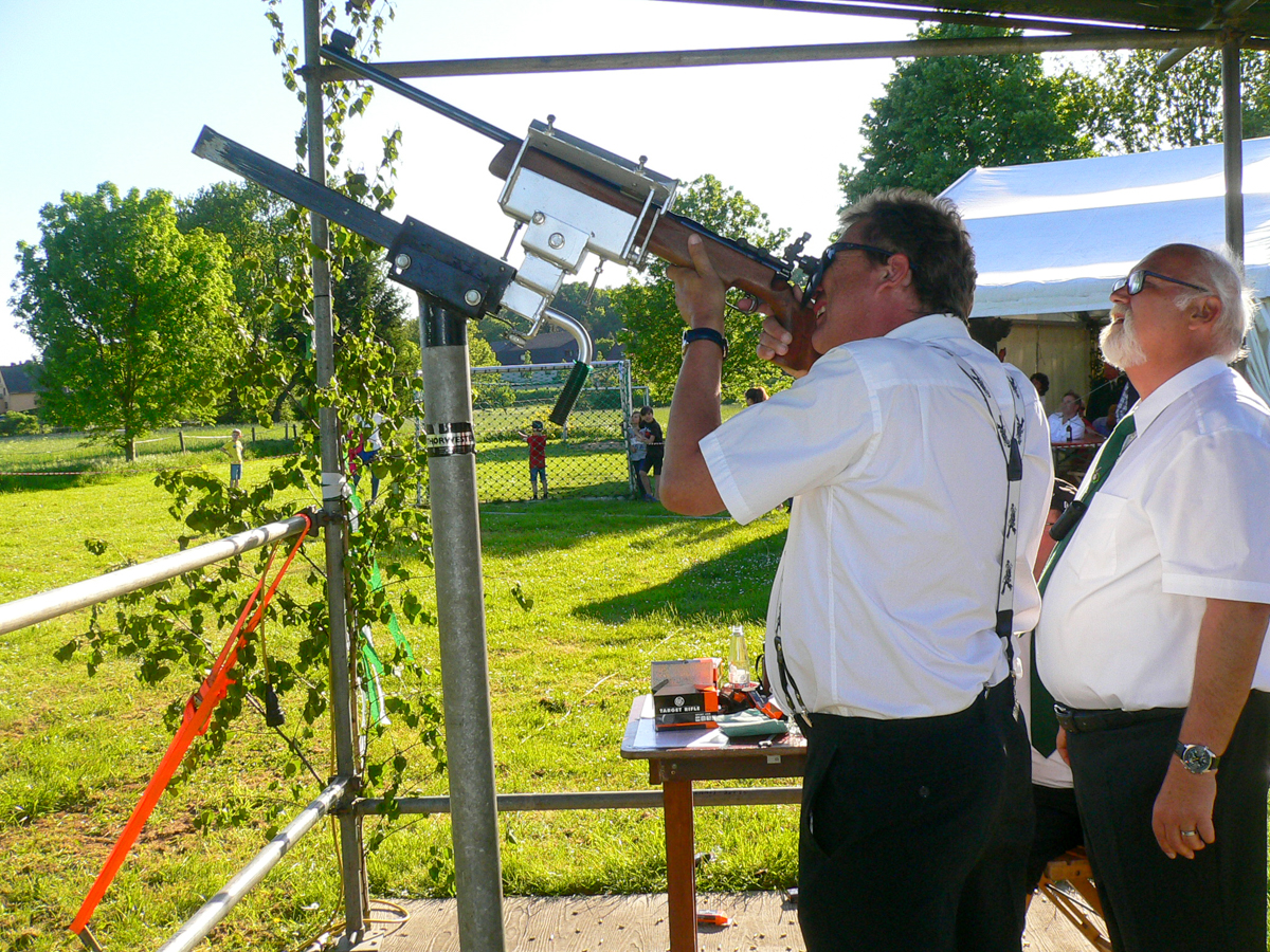 Bei genialem Sommerwetter und angefeuert von einer großen Zuschauermenge hatten sich Dirk Hollender, Andreas Kempken, Heinz Frütel, Nils Meyer, Stefan Heigbes und Kurt Dawirs dem äußerst spannenden und fairen Wettkampf gestellt. Nachdem Nils Meyer, aktiver Sappeur, schon einen großen Teil vom Fuß des Vogels abgeschossen hatte, gelang Heinz Frütel mit dem 217. Schuss um 20.15 Uhr der Treffer zum ersehnten Sieg und damit zur Königswürde.