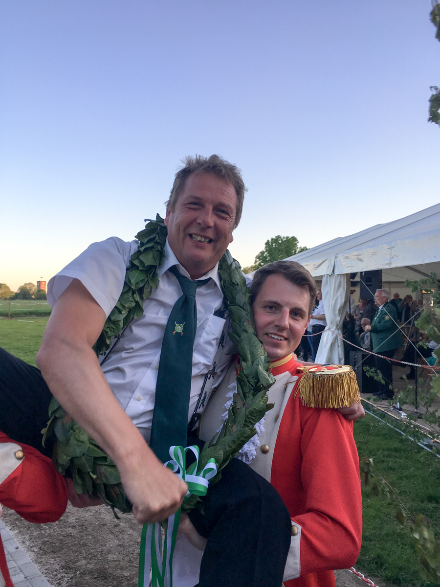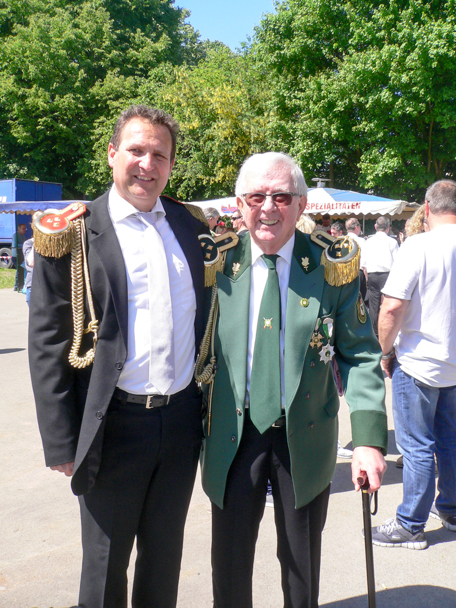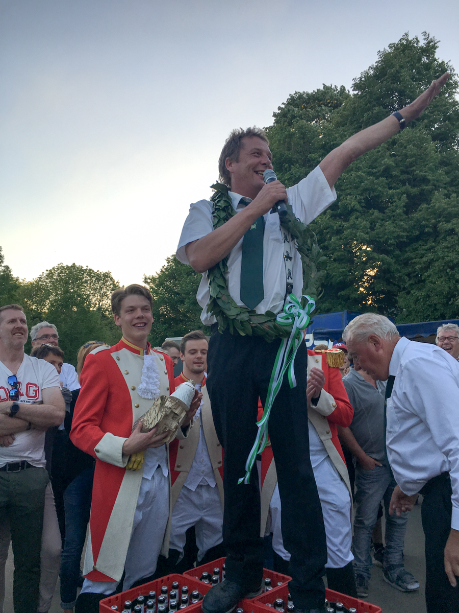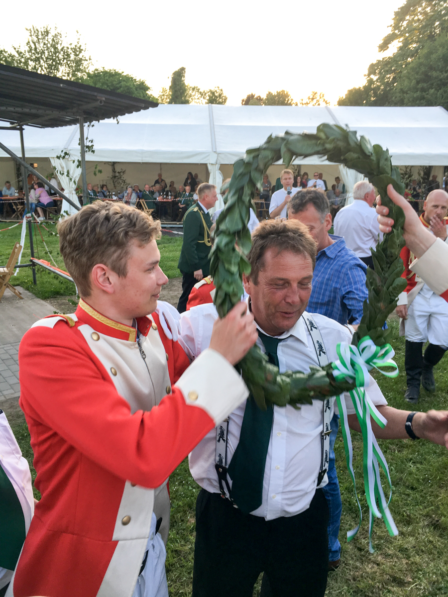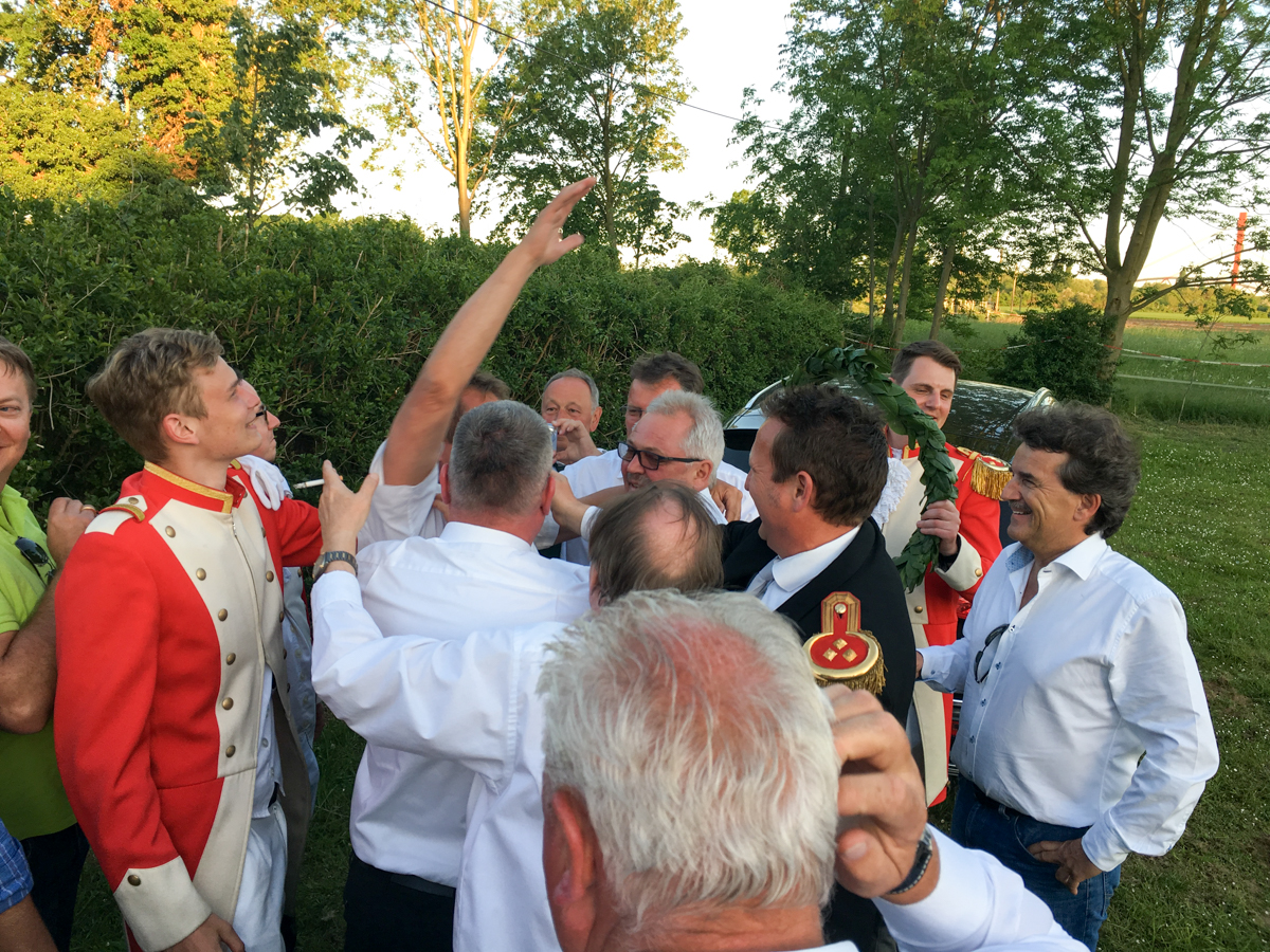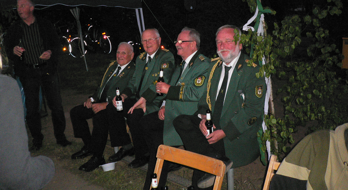Bei genialem Sommerwetter und angefeuert von einer großen Zuschauermenge hatten sich Dirk Hollender, Andreas Kempken, Heinz Frütel, Nils Meyer, Stefan Heigbes und Kurt Dawirs dem äußerst spannenden und fairen Wettkampf gestellt. Nachdem Nils Meyer, aktiver Sappeur, schon einen großen Teil vom Fuß des Vogels abgeschossen hatte, gelang Heinz Frütel mit dem 217. Schuss um 20.15 Uhr der Treffer zum ersehnten Sieg und damit zur Königswürde.