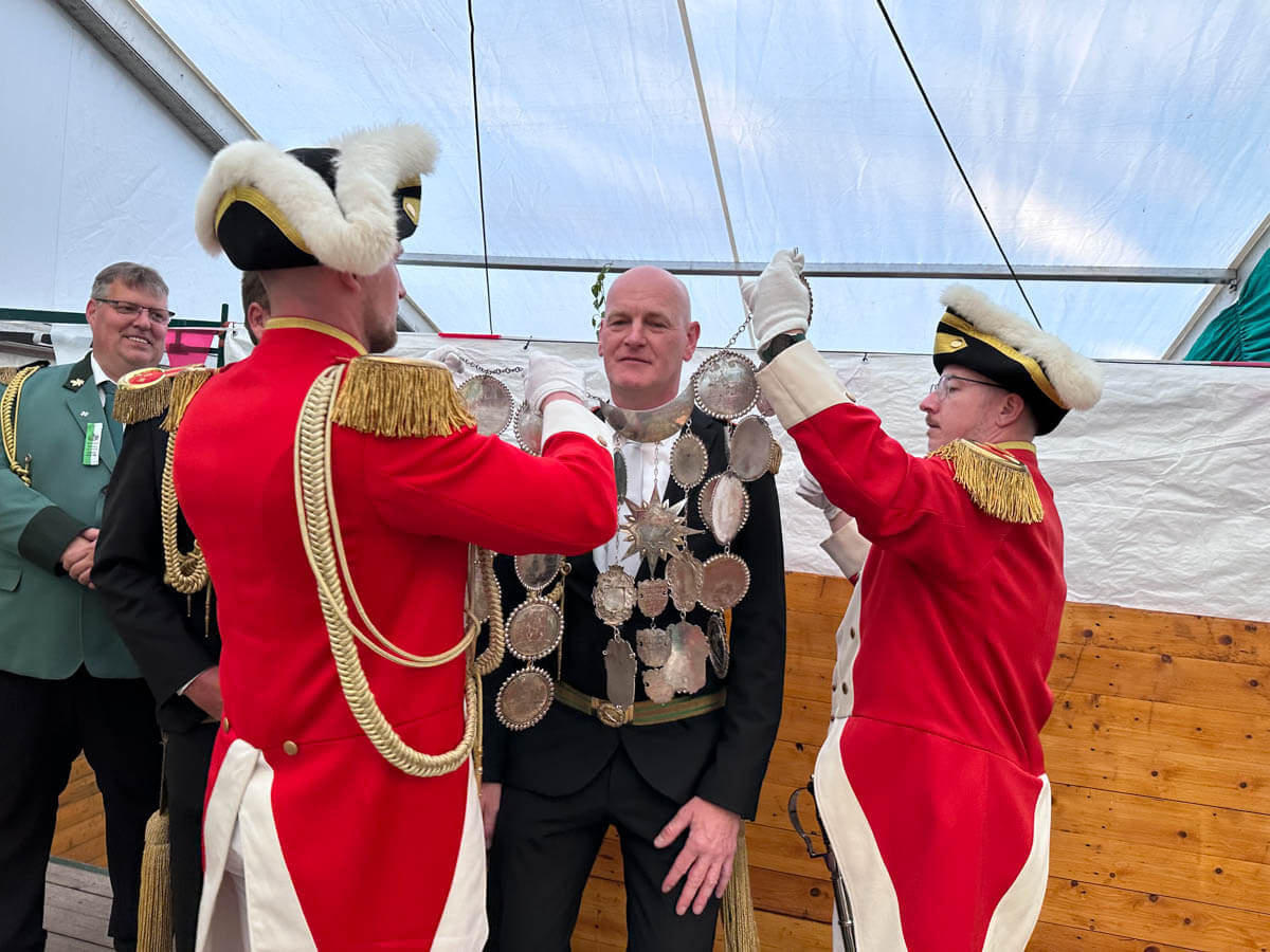König Bernie (2023) bekommt das historische Königssilber umgehängt